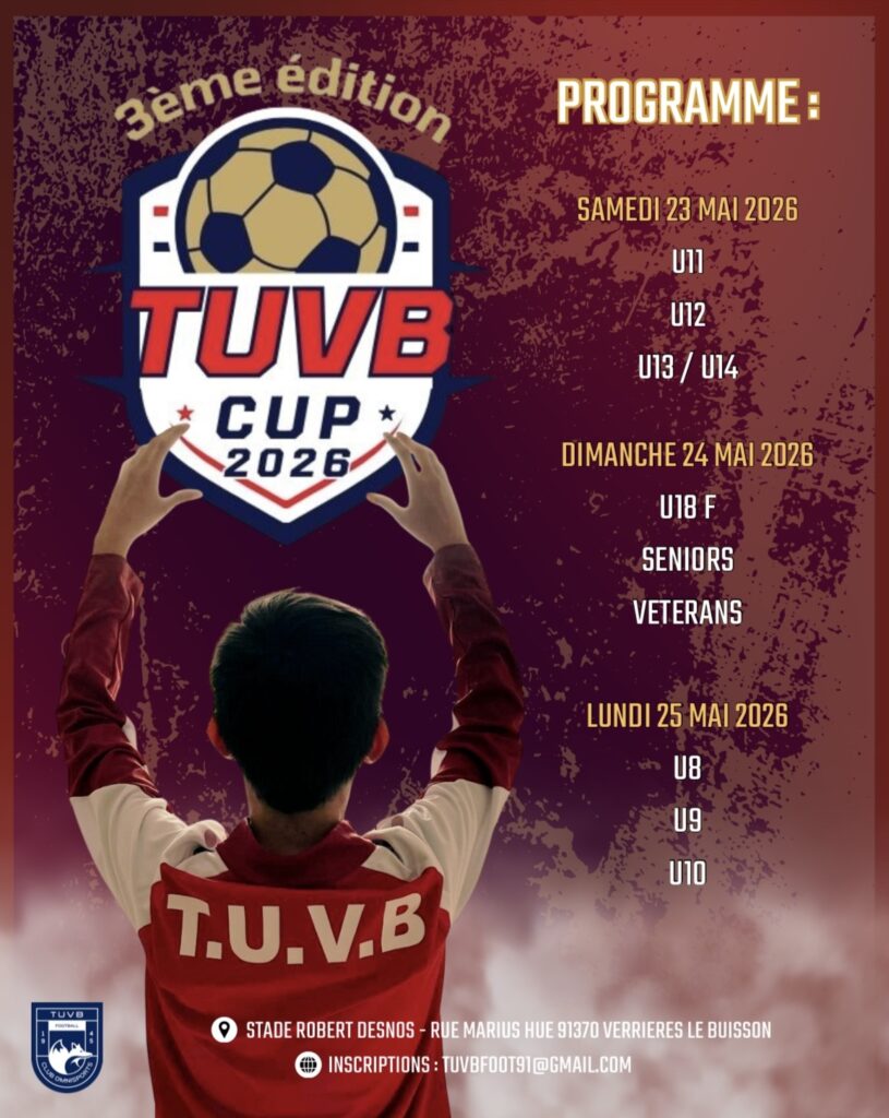 Nous avons le plaisir de vous annoncer la 3ᵉ édition de la TUVB CUP, qui se déroulera les 23, 24 et 25 mai 2026. Cet événement sportif est l’occasion idéale de partager un moment convivial autour de notre passion commune : le football.